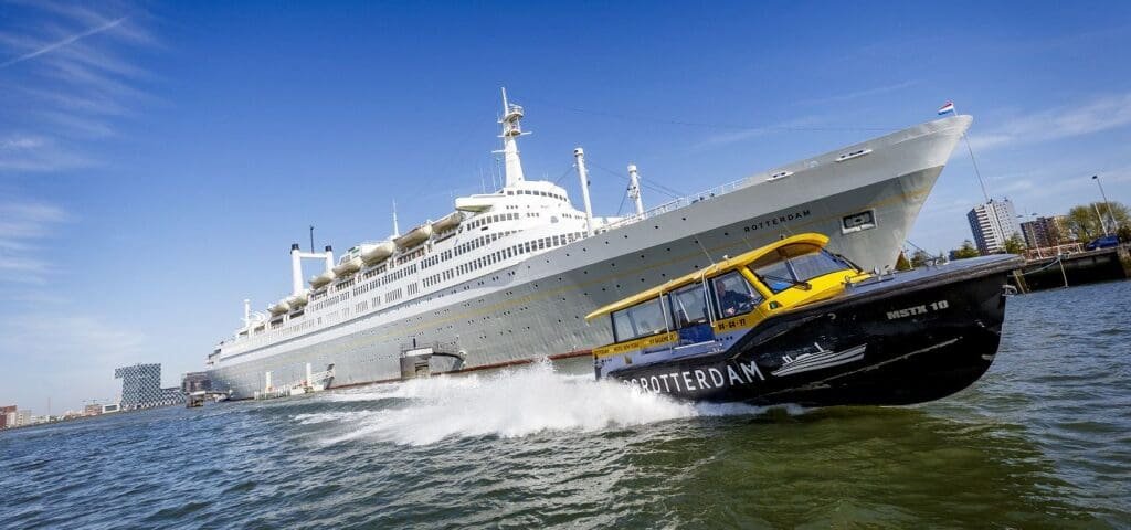 The wild waves, the splashing water of the Maas, the wind in your face. With high speed you slide over the water to the center of Rotterdam with a watertaxi. It is quick and easy. Adults pay € 5.00 per person for a single trip. The water taxi leaves from the pontoon on the B-Deck.